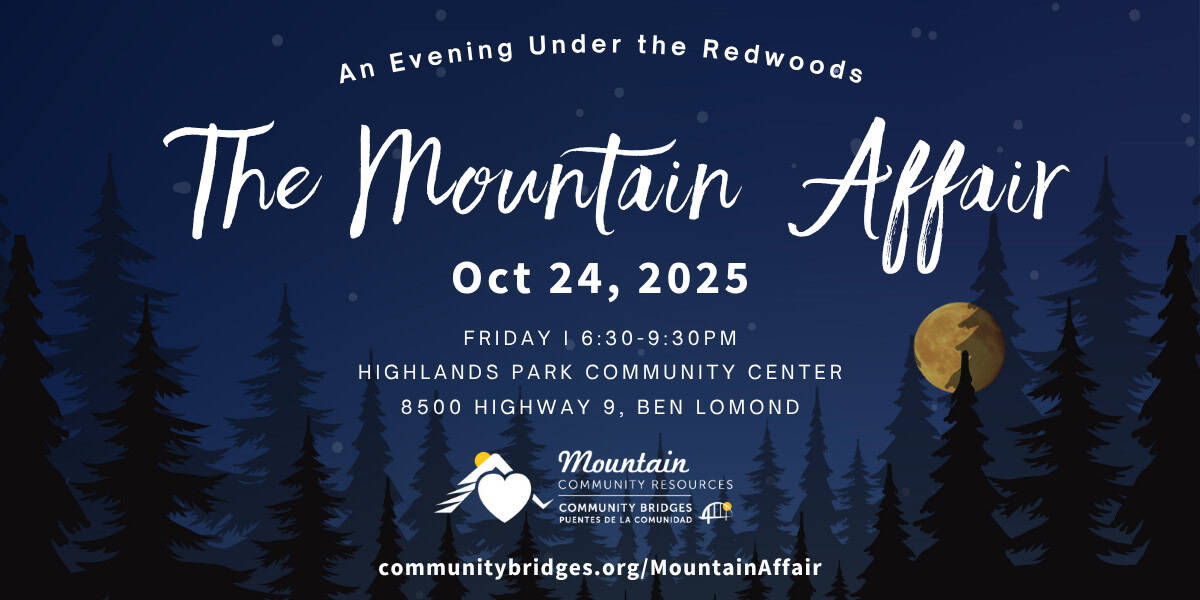 Please join us in celebrating the 40th Annual Mountain Affair at Highlands Park Senior & Community Center in Ben Lomond on Friday, October 24 from 6:30-9:30pm benefiting Mountain Community Resources.